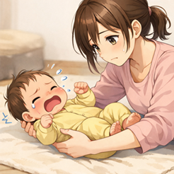 あかちゃんが泣くので抱っこしてあやす。泣き止んで床に下すとまた泣き出す。この繰り返しは辛い。